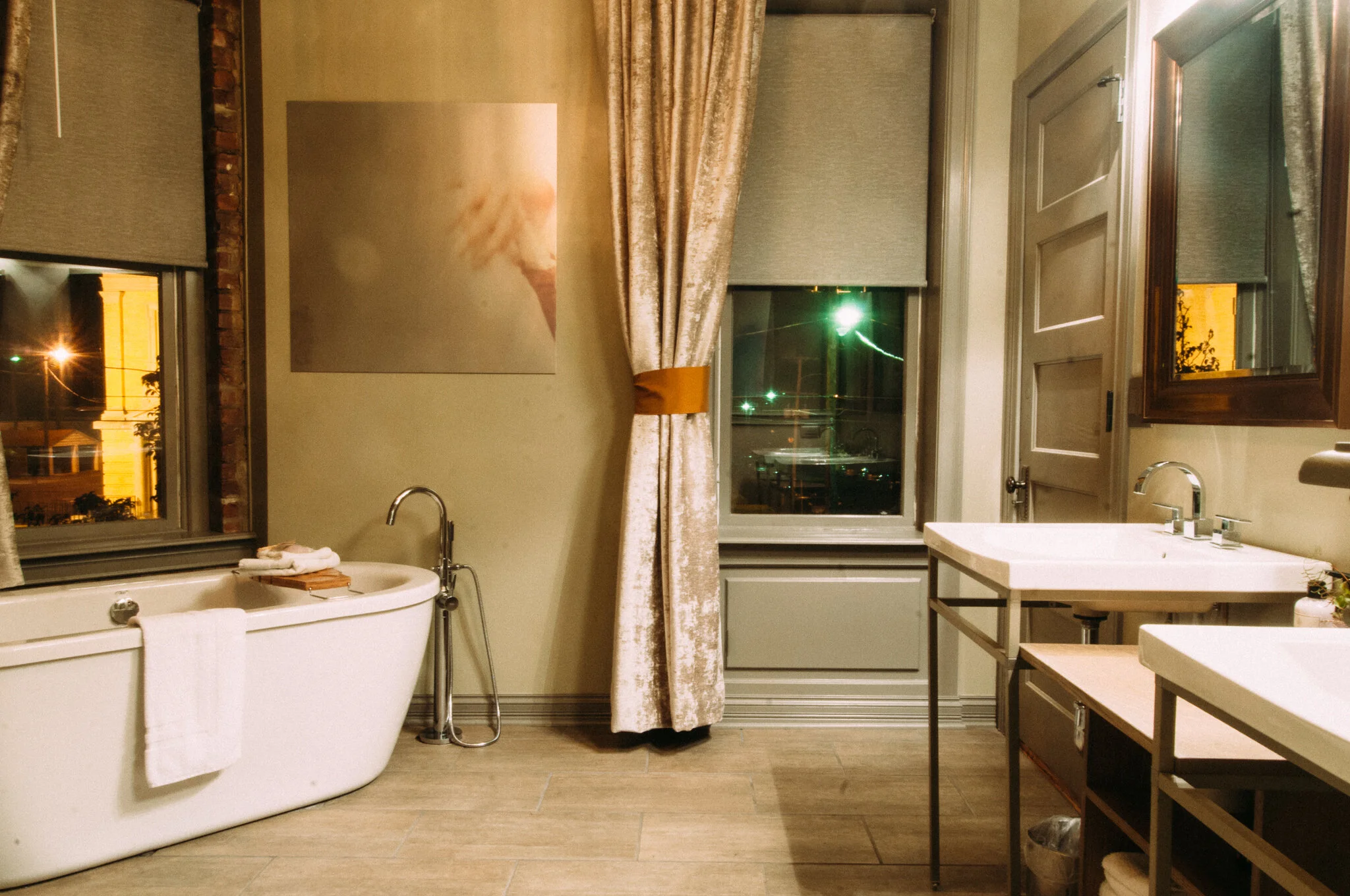 King size bed, luxurious bedding, apple TV, free wifi, desk, double shower head, double vanity, soaking tub, alarm clock, hairdryer, white noise machine, mini-fridge, and (2) $5 beverage tokens. This room features products, designs, and works by local Louisvillians: